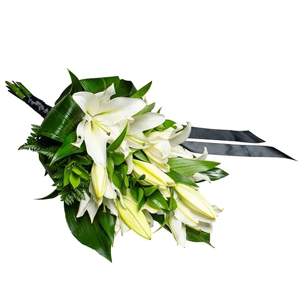 Elegantne matusekimp valgetest liiliatest, mida täiendab sobiv kimburoheline. Klassikaline ja rahulikes toonides leinalillede kimp, mis sobib kaastunde avaldamiseks ning lahkunu mälestuse austamiseks. Väärikas valik matuselilledeks mälestustseremooniale, ärasaatmisele või kalmistule viimiseks.